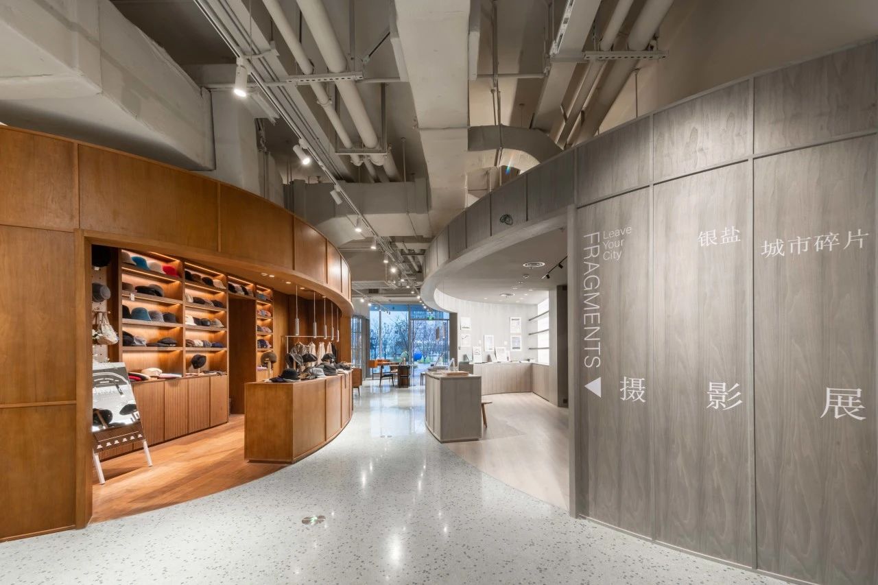 繞過裝置,進入“大屋頂SPACE&銀鹽”集合空間,單向空間佇立于入口處左邊的區域,大量經典的人文社科類書籍陳列在木質結構的弧形空間中;與之相對而立的是一大塊戶外&生活區域,由鋁板、筋石板、水磨石等材料構建而成,自行車、服飾和廚具等戶外用品充斥其間。