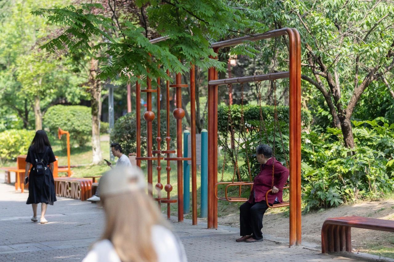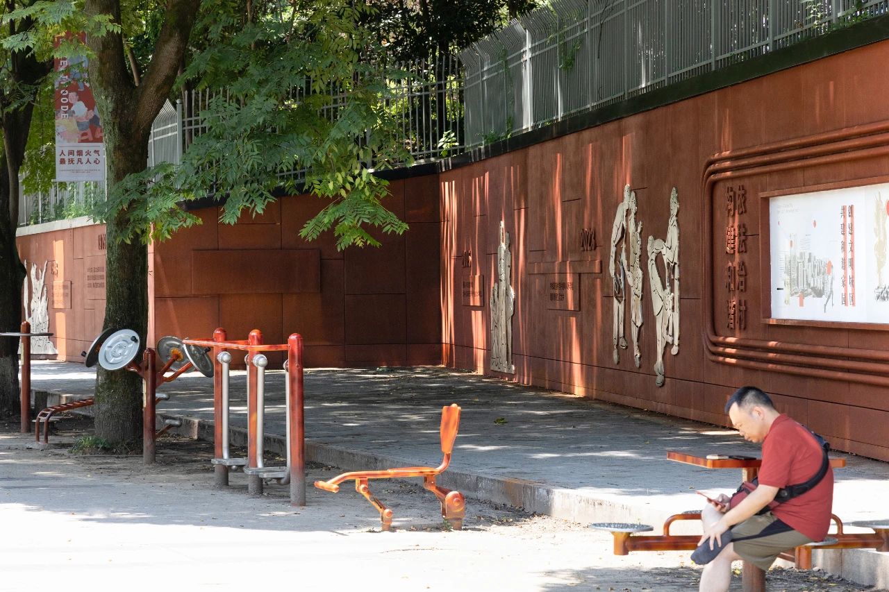 龍井公園地處龍井村核心地區(qū),緊鄰廣益中學(xué)和農(nóng)貿(mào)市場(chǎng),承載著居民日常休閑活動(dòng),是龍井村更新提升中重要的一環(huán)。設(shè)計(jì)通過(guò)更新場(chǎng)地的功能設(shè)施,增設(shè)文化景墻、休閑健身設(shè)施、公共休閑座椅,有效提升了公共空間的美觀度、舒適性與便利性。改造后,人們?cè)跐夂竦奈幕諊锘顒?dòng)休憩,瀏覽文化墻上篆刻的過(guò)往,歷史的記憶與現(xiàn)在的生活相呼應(yīng),形成動(dòng)人的空間記憶。